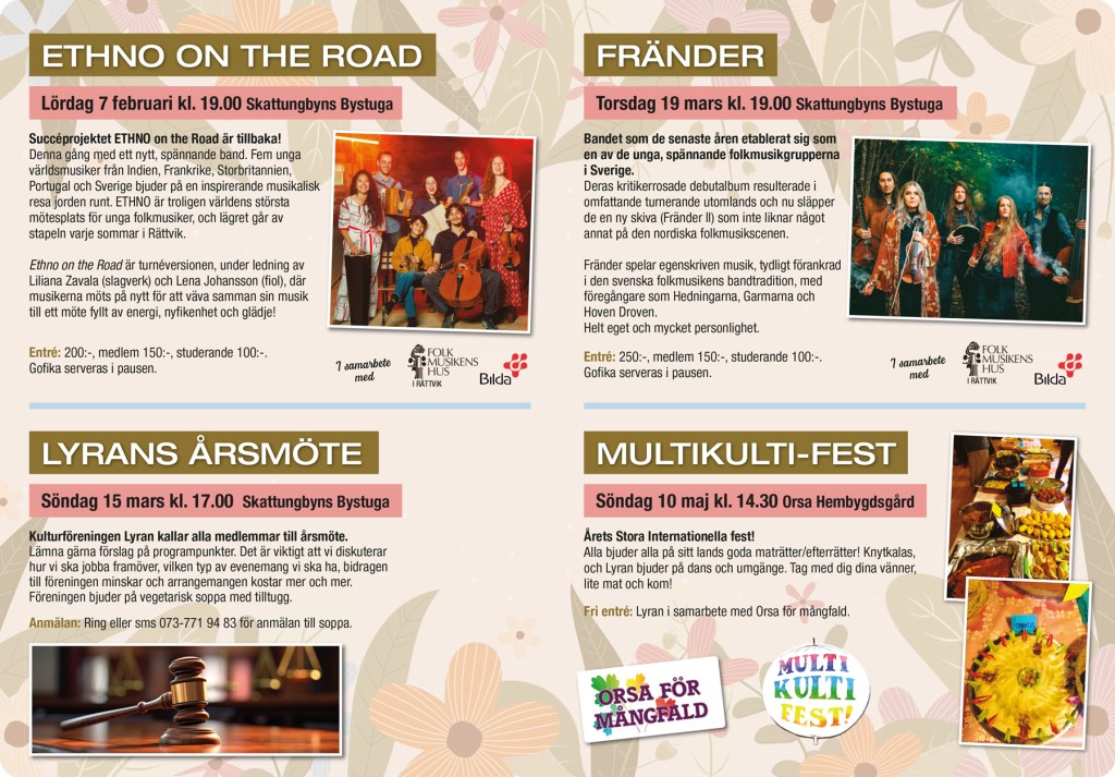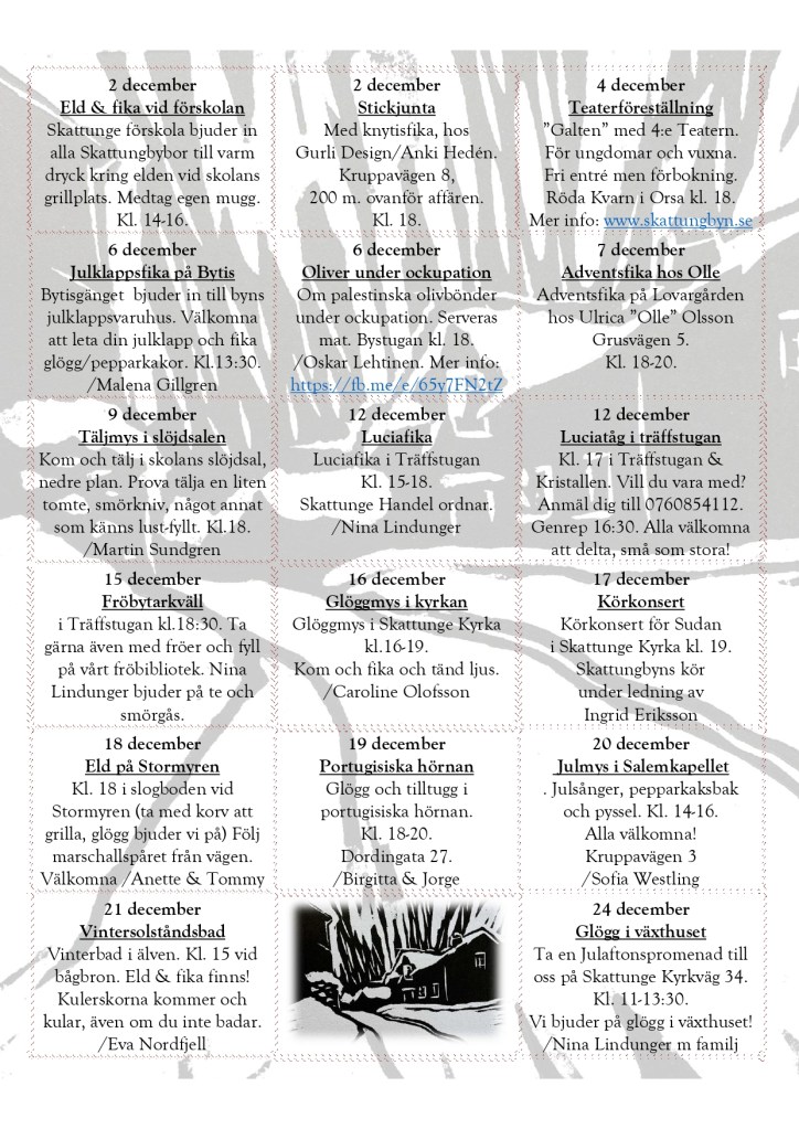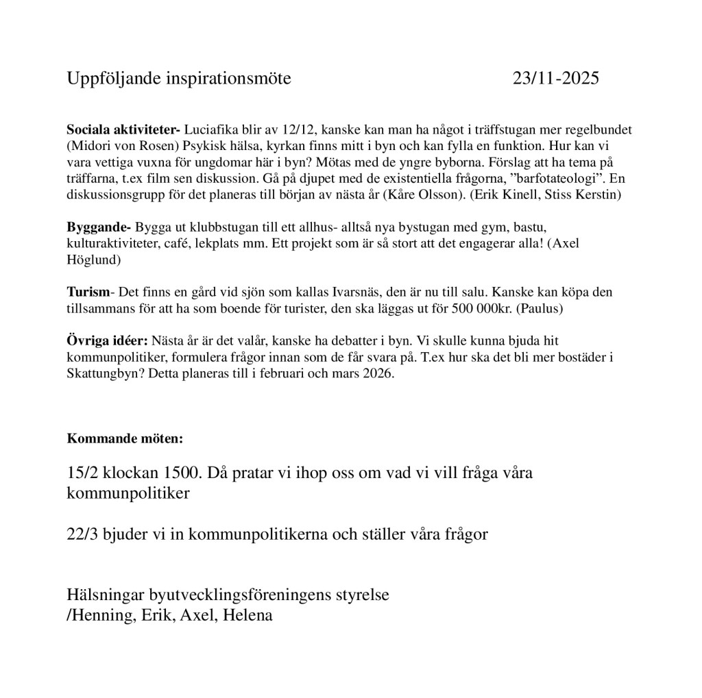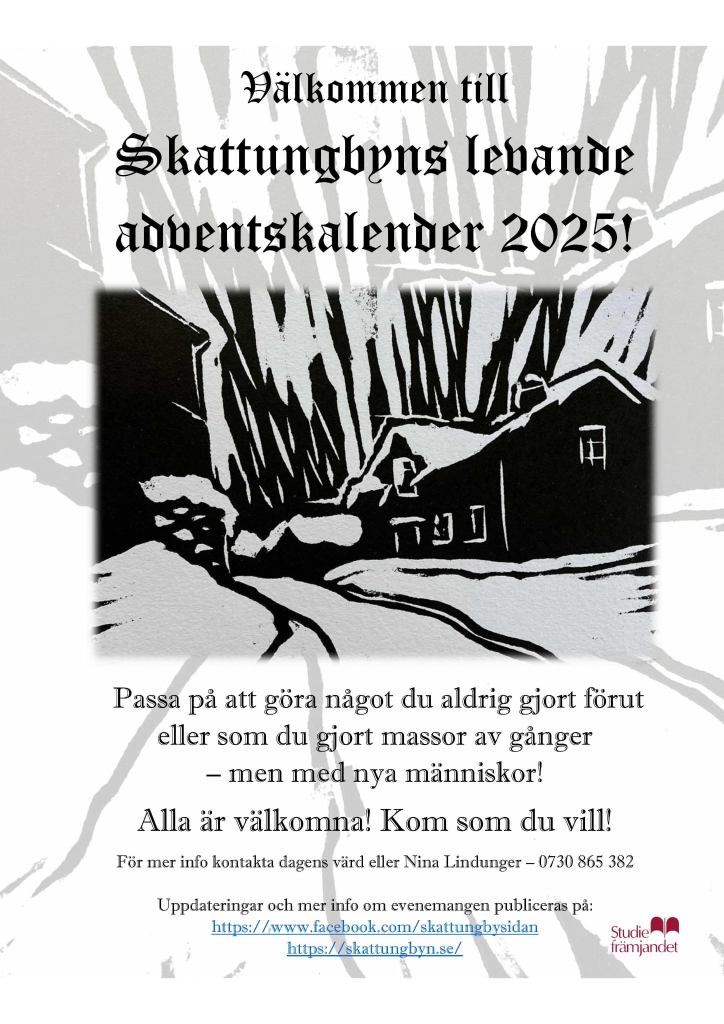 Du som är boendes i Skattungbyn (ingen medlemsavgift, alla är med, det är sedan gammalt) – Välkommen med förslag på sång och musik, teater, konst, litteratur, från hembygd till globalt, mat, dans, vandringar, tankar om livet, föreläsningar och om utveckling av byn m.m. – allt genomförs i möjligaste mån från ca april/maj när besked från kommunen väntas komma och ett år framåt.