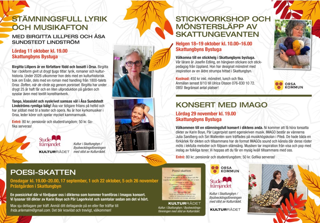 Föreningen startade i Skattungbyn, och har sin bas här, men ordnar kulturevenemang även i Orsa, och många reser långa vägar för att delta.